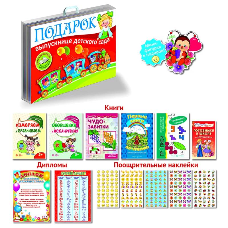 Чего в ней только нет!...  Книжки на развитие логики и математических способностей, увлекательное чтение, занимательные графические диктанты, знакомство с цветом и формой и многое другое, без чего будущей первокласснице просто не обойтись! Помимо этого, красочно оформленный  алфавит с прописными  и строчными буквами, пять блоков с поощрительными наклейками и, конечно же, самый настоящий диплом выпускнице детского сада!