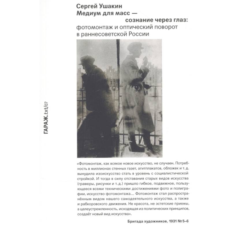 Седьмая книга серии «ГАРАЖ.txt» написана профессором кафедры антропологии и кафедры славянских языков Принстонского университета Сергеем Ушакиным. Его исследование посвящено явлению фотомонтажа в раннесоветской России.